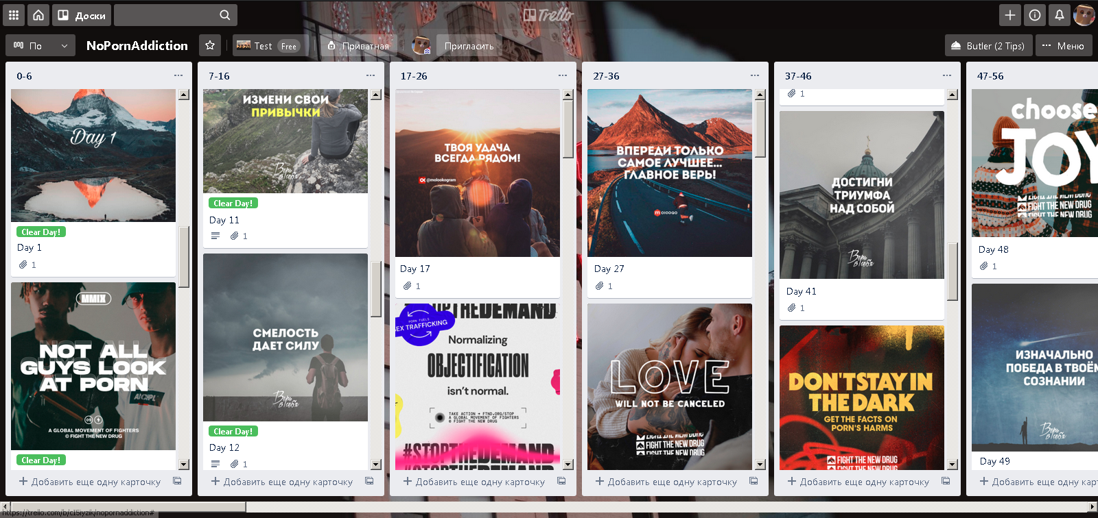 Карточки с картинками на ваше усмотрение, я для теста сделал так. +Можно себе сделать метки для чистого дня, 10 дней, 20, 30, помечать, когда вы висели на волоске. Ну и делать записи внутри этих карточек.